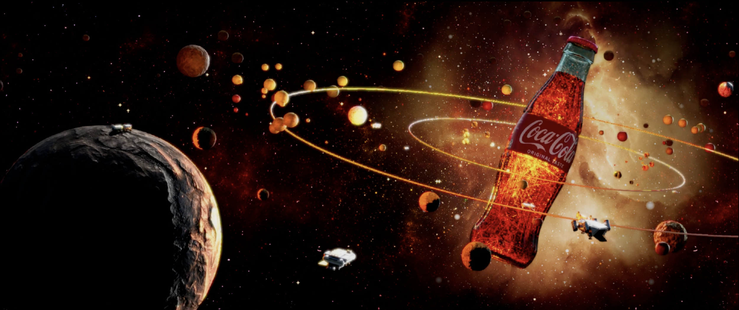 Concept: A solar system filled with asteroids, planets, and spaceships revolves around its central life source, the majestic Coca-Cola bottle.